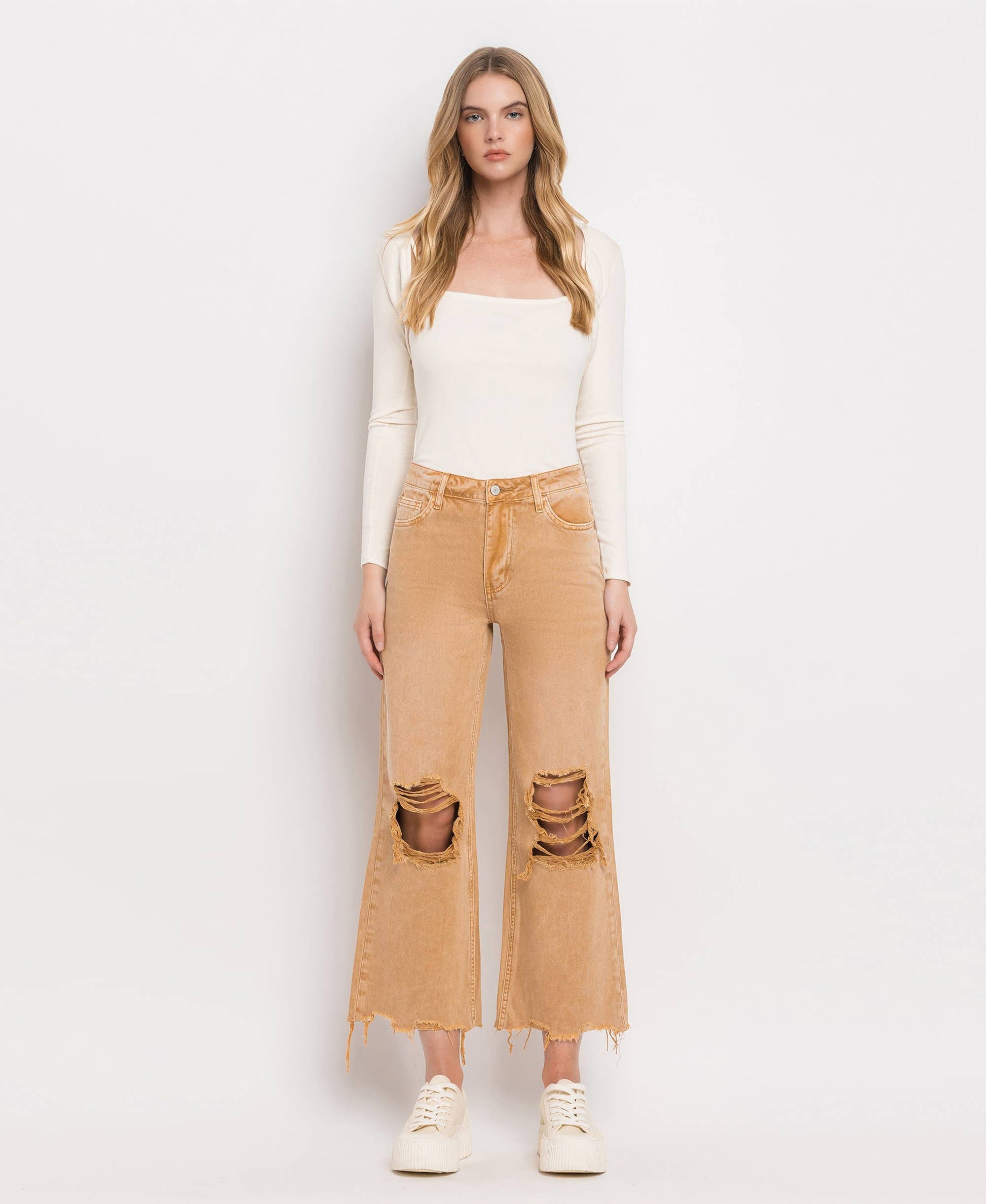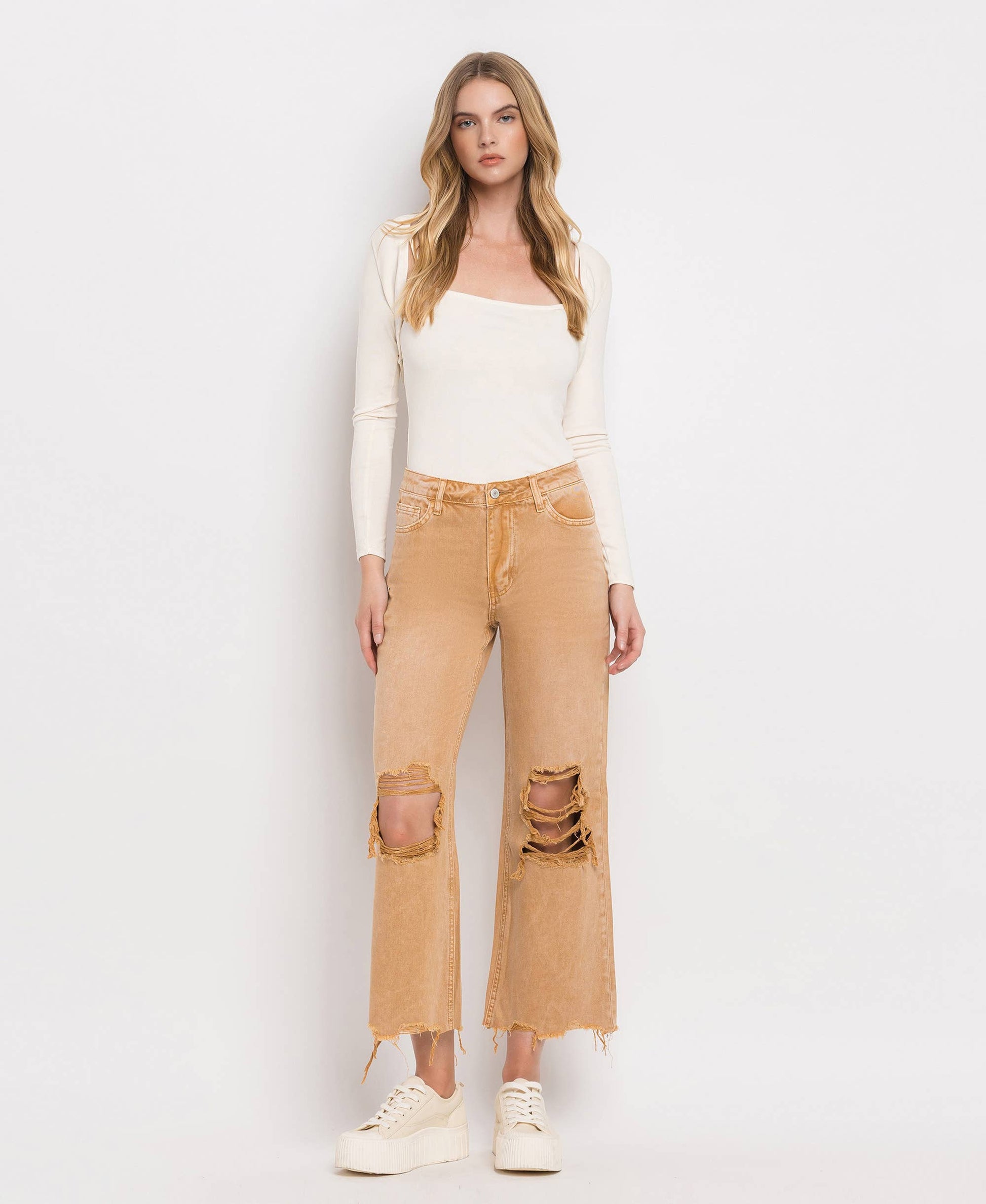 NON STRETCH DENIM, SUPER HIGH RISE WAIST, 90'S VINTAGE STYLE, DISTRESSED DETAIL, RAW HEM WITH DESTRUCTION, CROPPED LENGTH, FLARE JEANS
