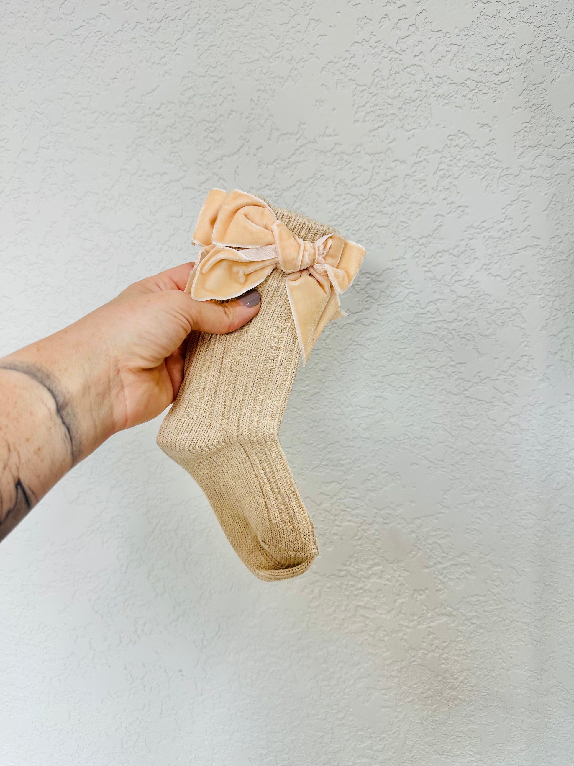 Big Velvet Bow Knitted Calf High Socks - Cream