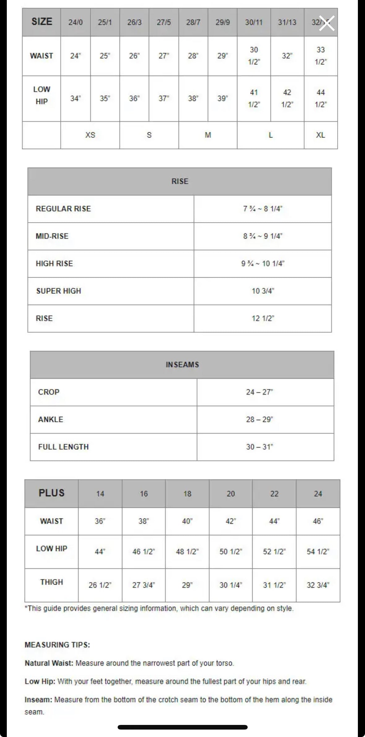 RISE: 10" / INSEAM: 3"' / LEG OPENING: 23 1/2"