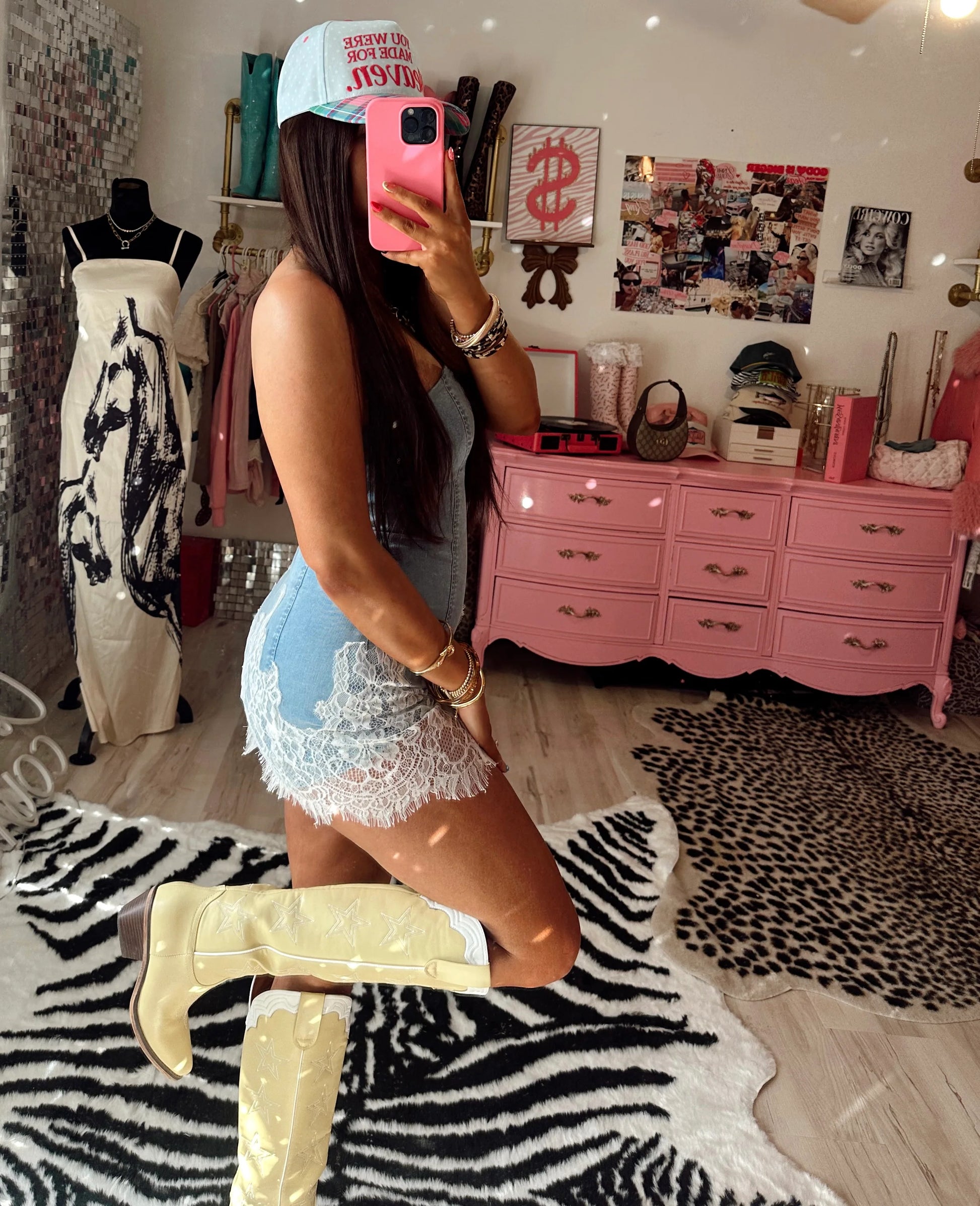 This one is a showstopper. It’s a romper that looks like a dress from the front, made from structured, super-stretch denim with real lace detailing at the hem. It’s designed to flatter and snatch you in, so it hugs in all the right places while still being comfortable.