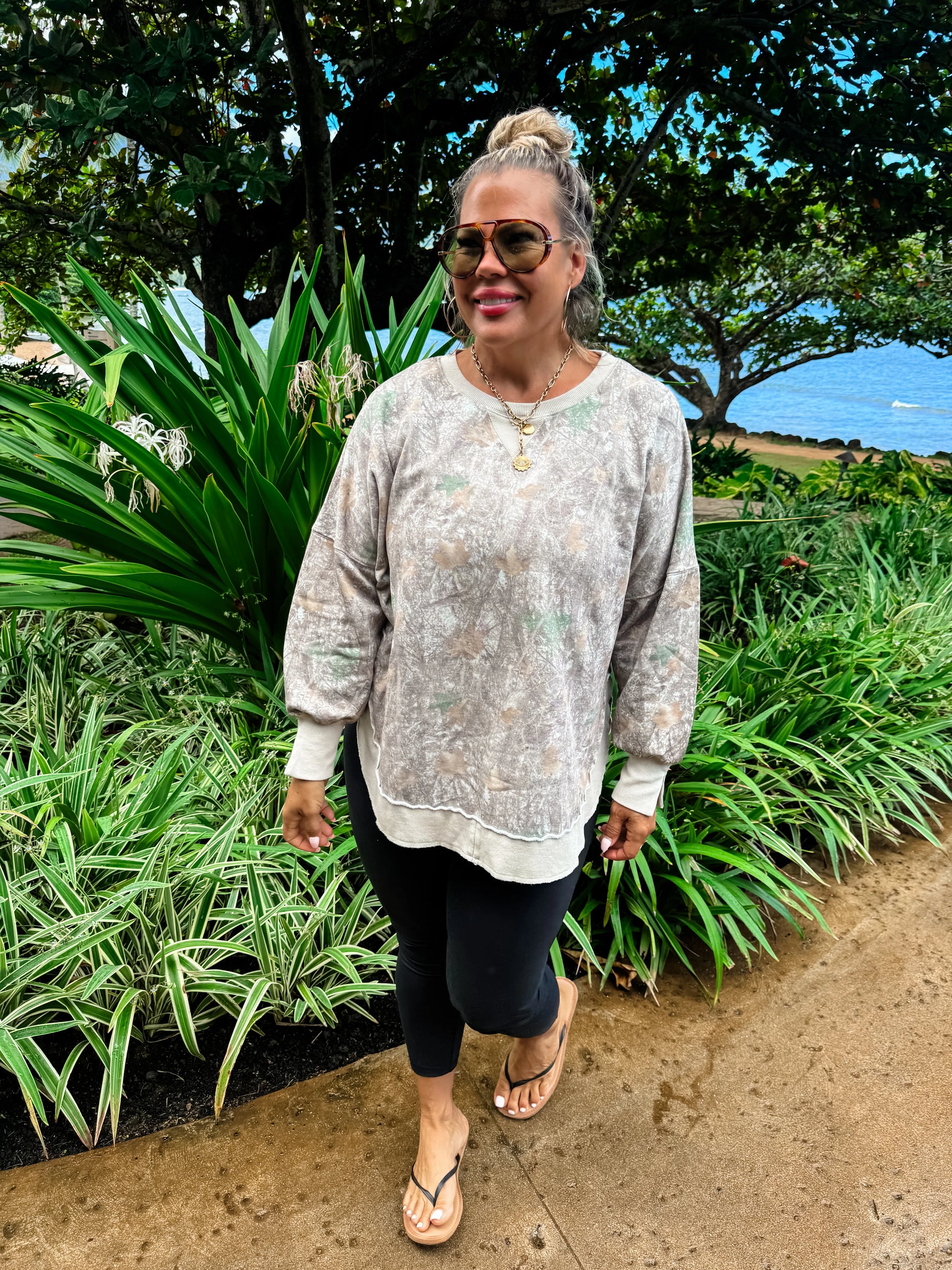 The perfect washed cotton flattering sweatshirt that everyone needs! Faded “vintage” colors. Features flattering rounded front and back hem with side slits!