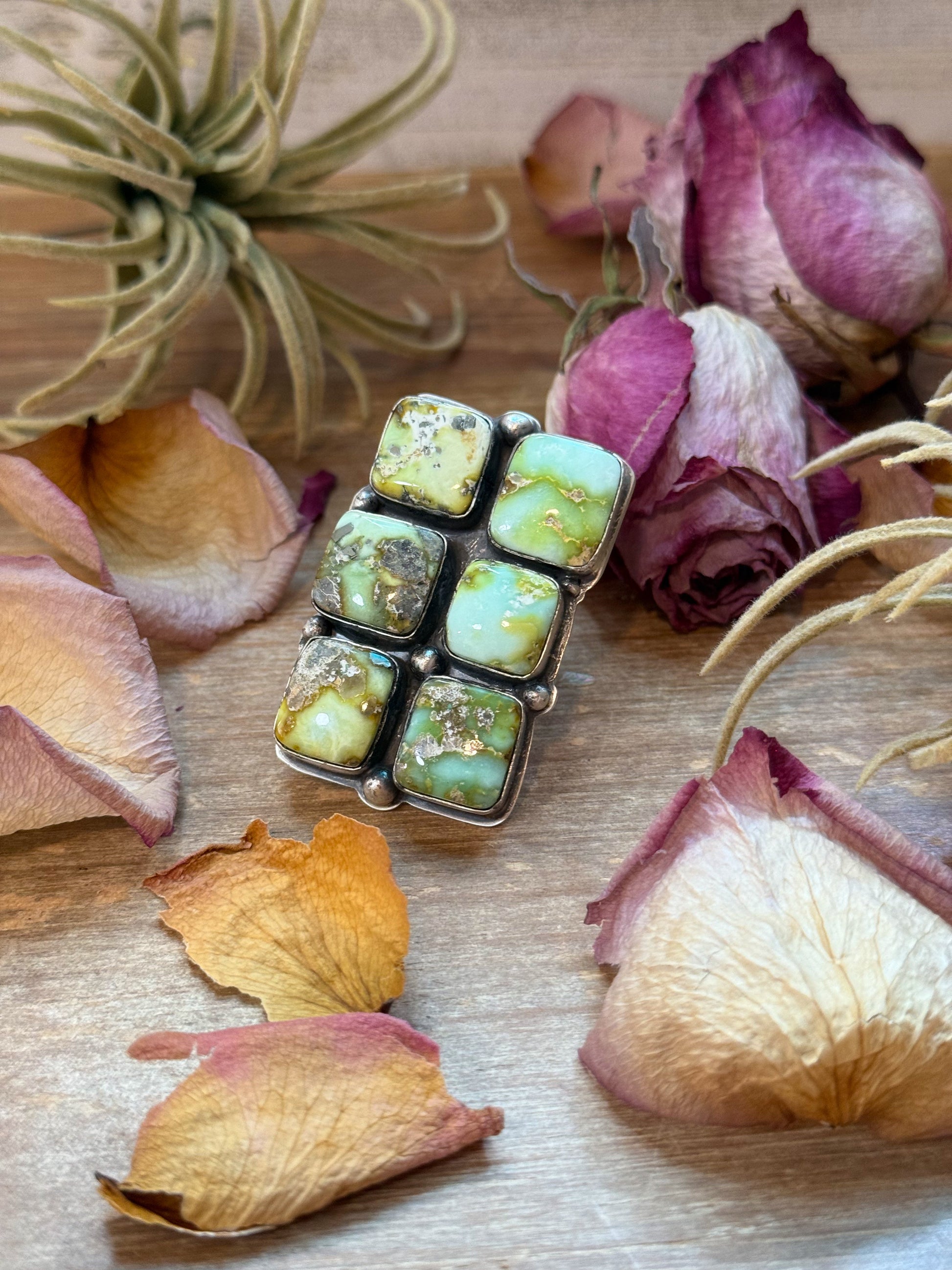 Handmade in New Mexico, USA by Navajo silversmith Boyd Ashley (BJA), this incredible 6-stone Palomino Turquoise ring is a true statement of artistry and heritage. The rare Palomino turquoise displays soft gold, tan, and blue-green hues — each stone perfectly arranged to create a bold, balanced design.