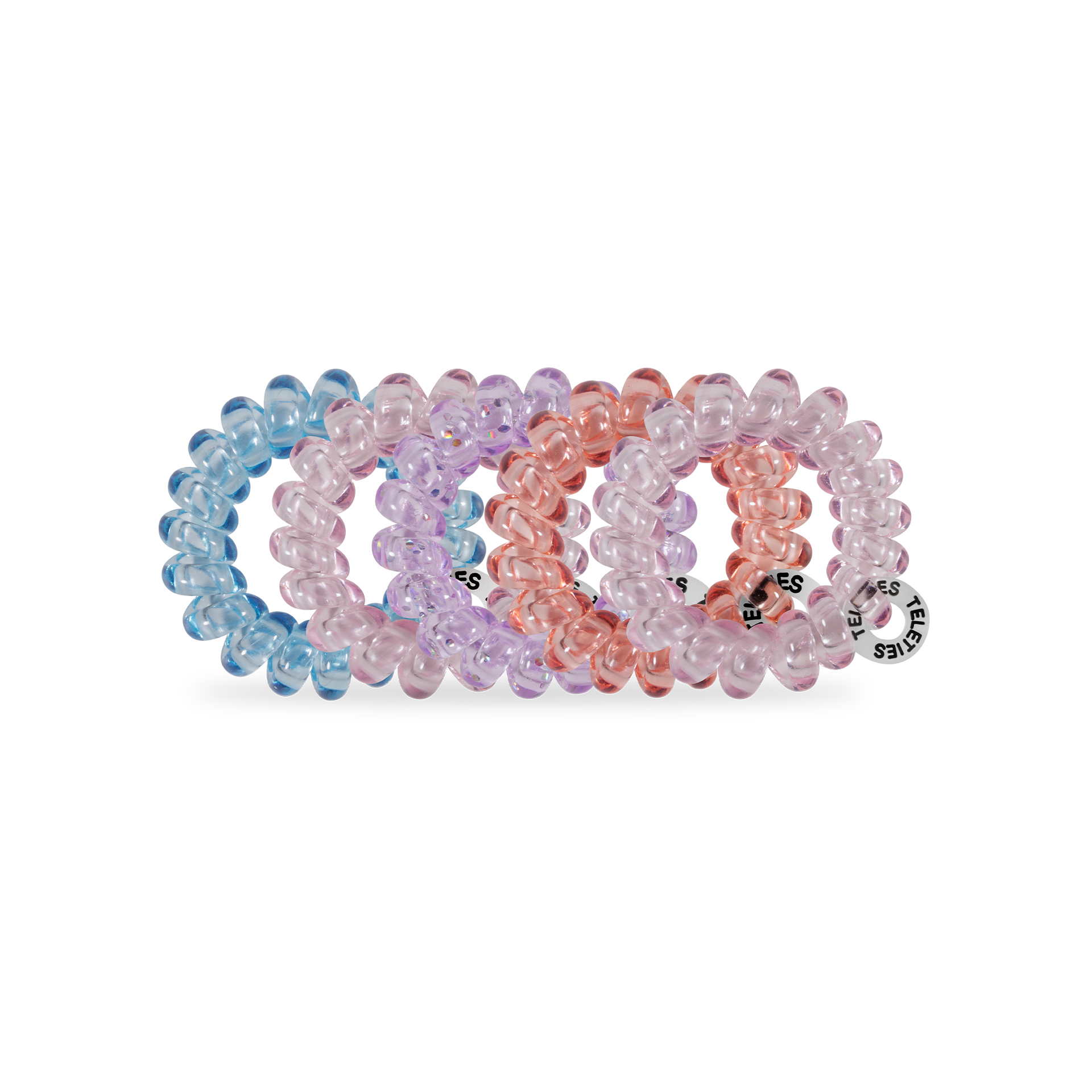 Sea Glass Tiny Hair Ties in clear pastels are the ultimate solution for securing braid ends, styling little kids' hair, or managing ultra-thin strands. These mini hair coils are designed to fit an adult finger like a ring rather than a bracelet, offering a strong, damage-free grip that keeps hair in place all day—without breakage, creases, or headaches.