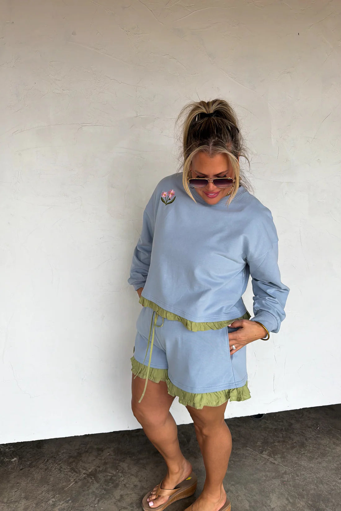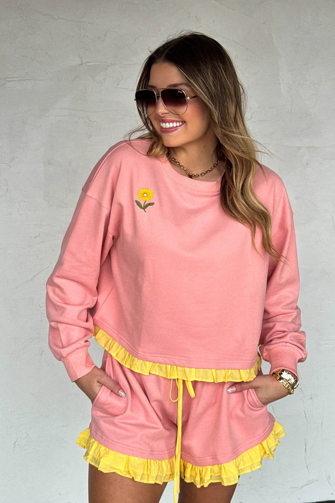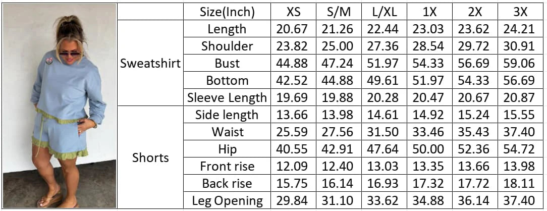Add a playful pop of color to your wardrobe with these ruffle trim skirt sets! Each set features a cozy, relaxed-fit sweatshirt paired with a matching drawstring skirtaccented by fun contrast ruffle detailing. Top has embroidered flower detail. Made from soft washed cotton fabric giving it a vintage wash look. Perfect for lounging, travel days, or casual outings