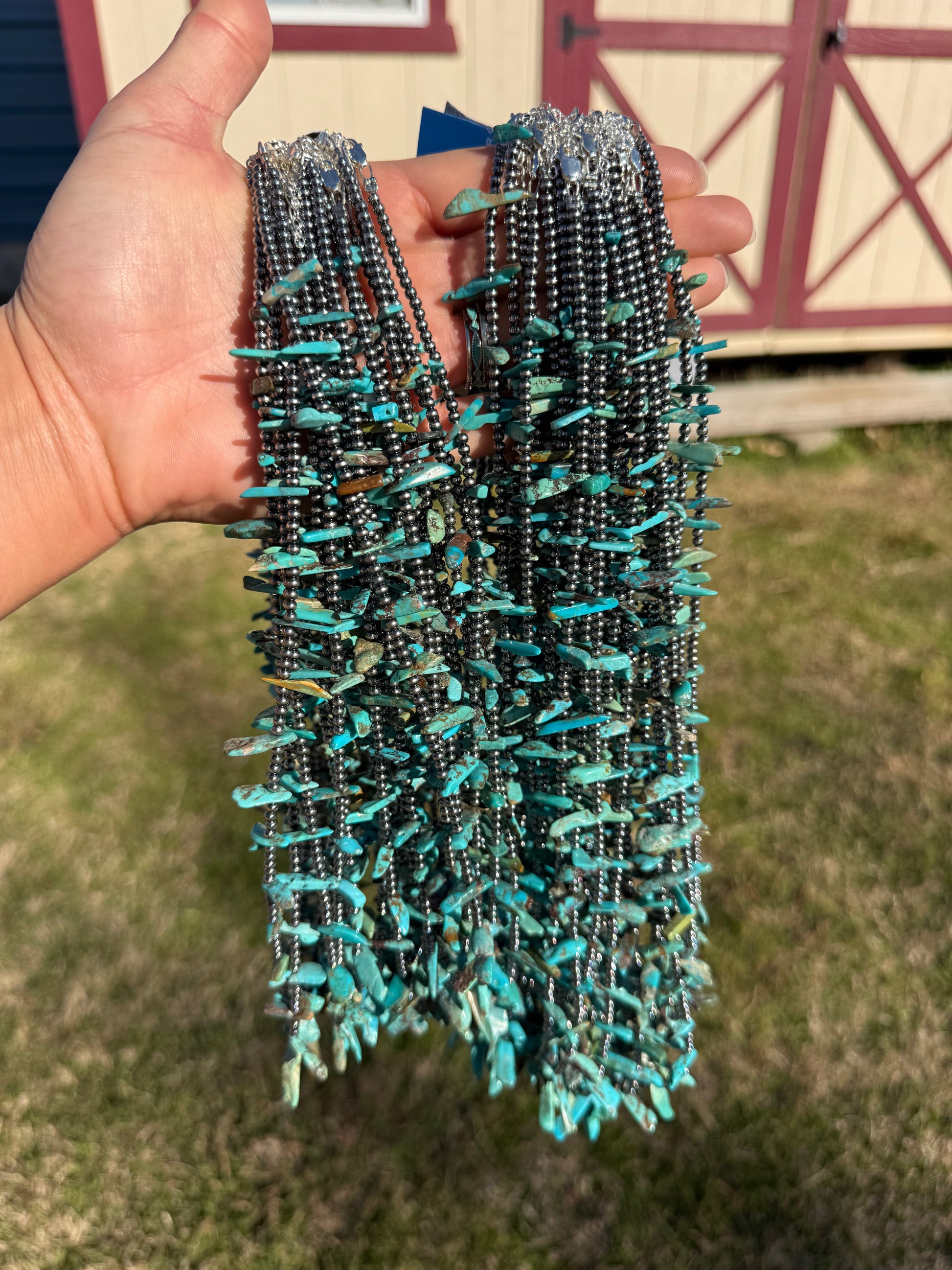 This beautiful 21-inch necklace mixes 3 mm sterling silver pearls with long blue turquoise beads for a fun, stylish look that layers beautifully with everything. Each strand is designed so every necklace has its own unique pattern and personality — no two will ever be exactly the same. Finished with sterling silver findings and a 2-inch extender, so you can adjust the length depending on your outfit.