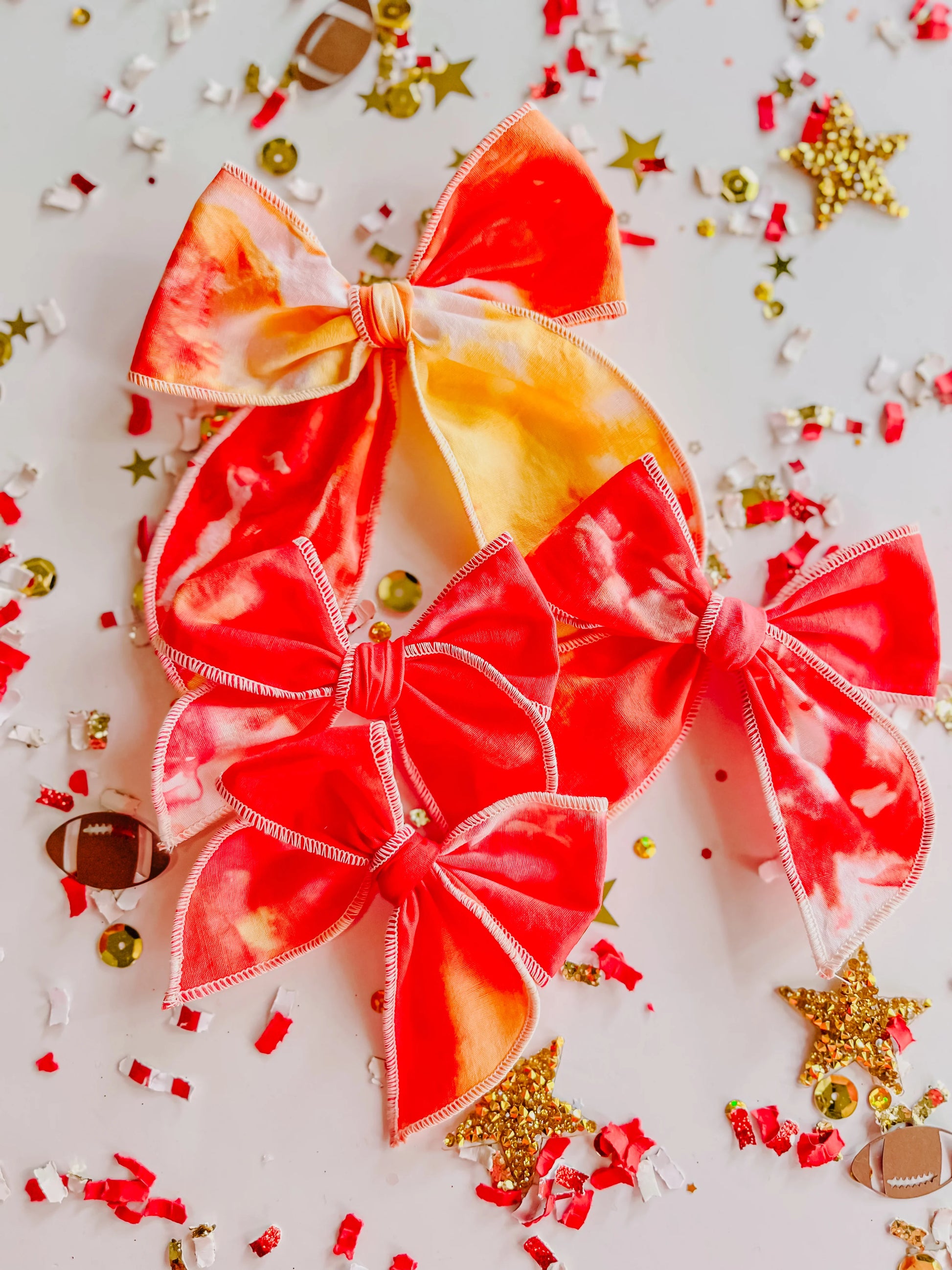 Show off your Chiefs pride with our Kansas City Chiefs themed handmade hair bows, crafted with the utmost attention to quality and detail. Made from high-quality fabric, these hair bows are perfect for fans of all ages. Available in three versatile sizes—small, medium, and oversized—these bows add a touch of team spirit to any hairstyle