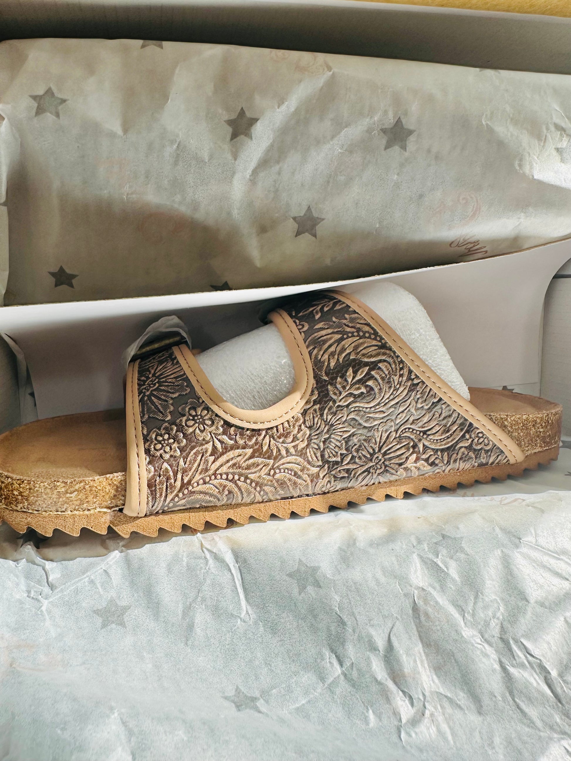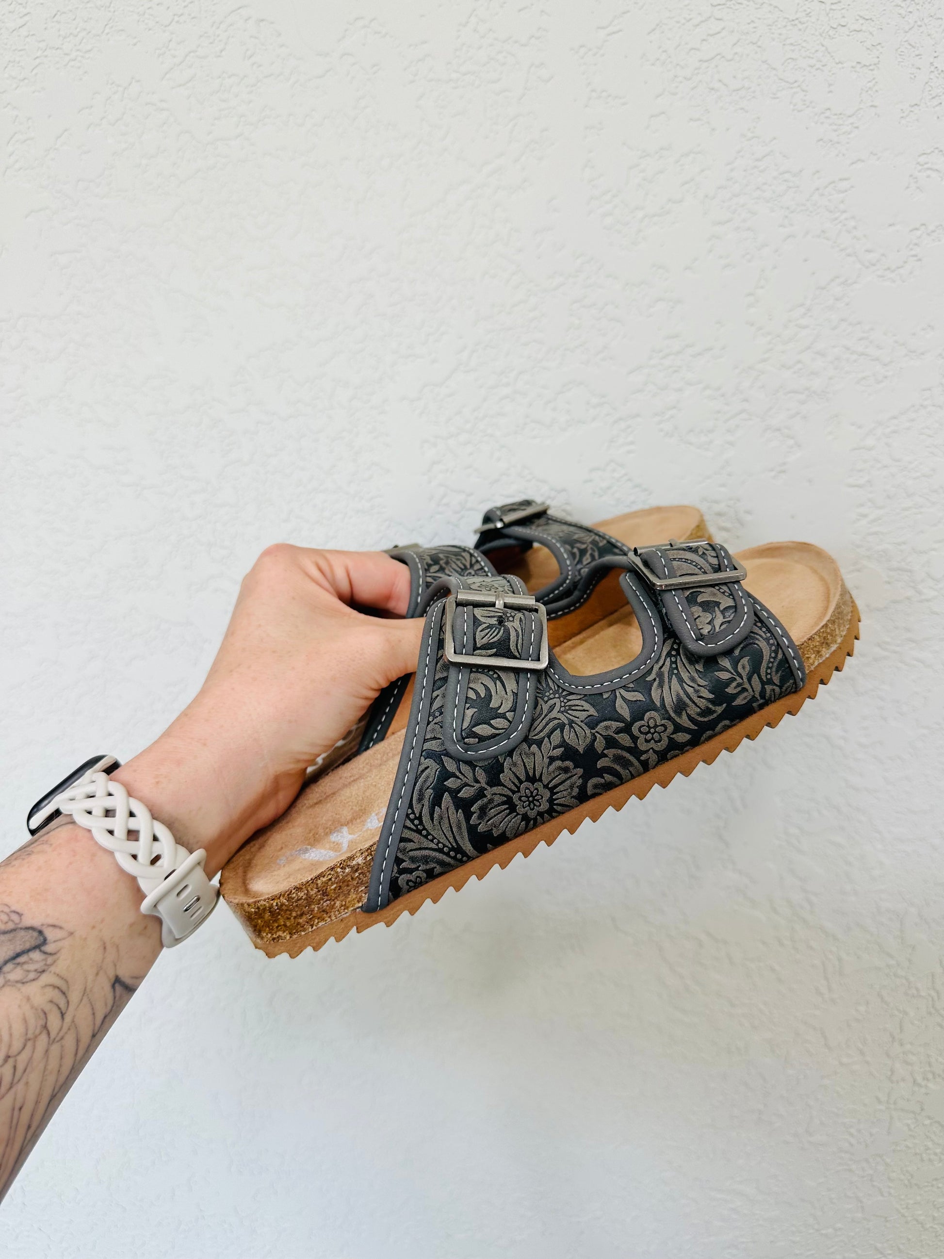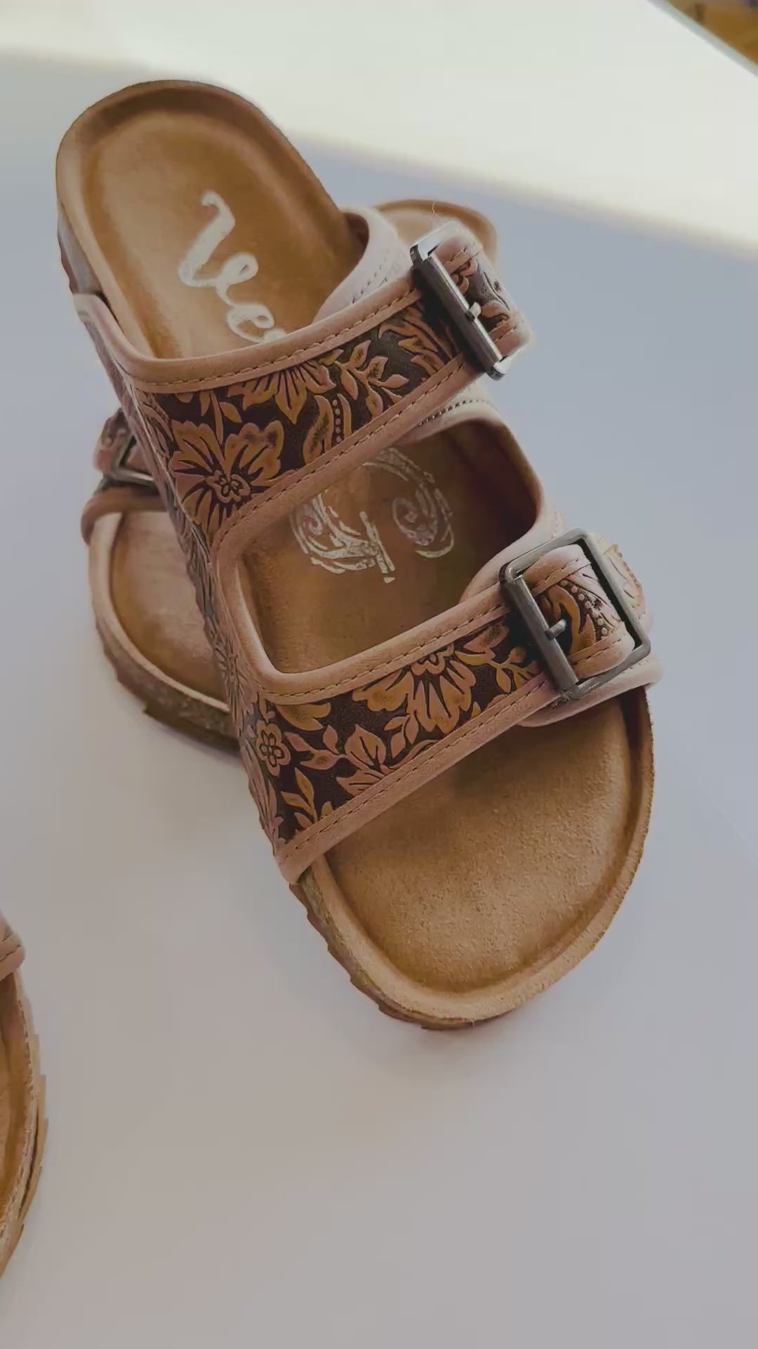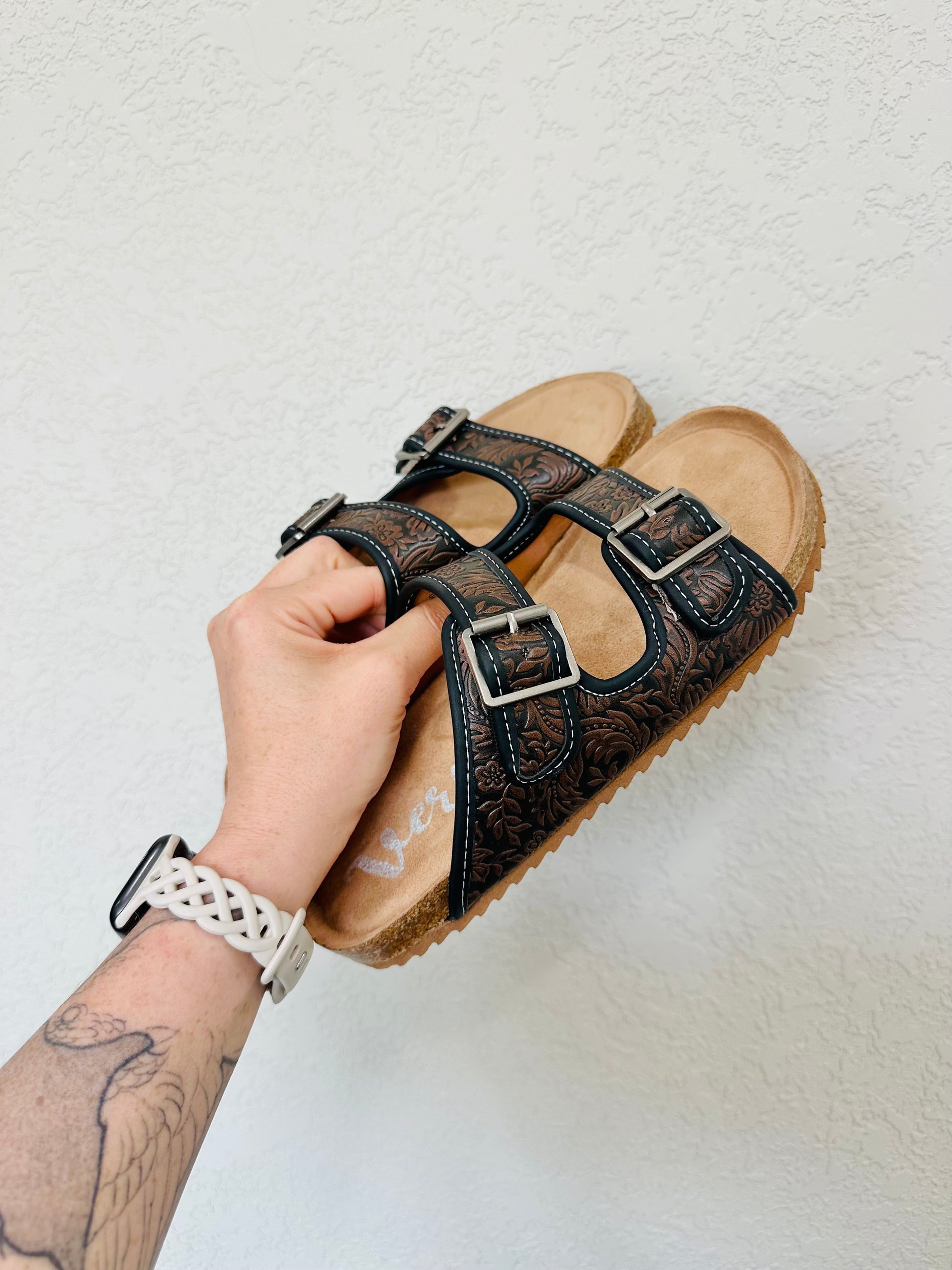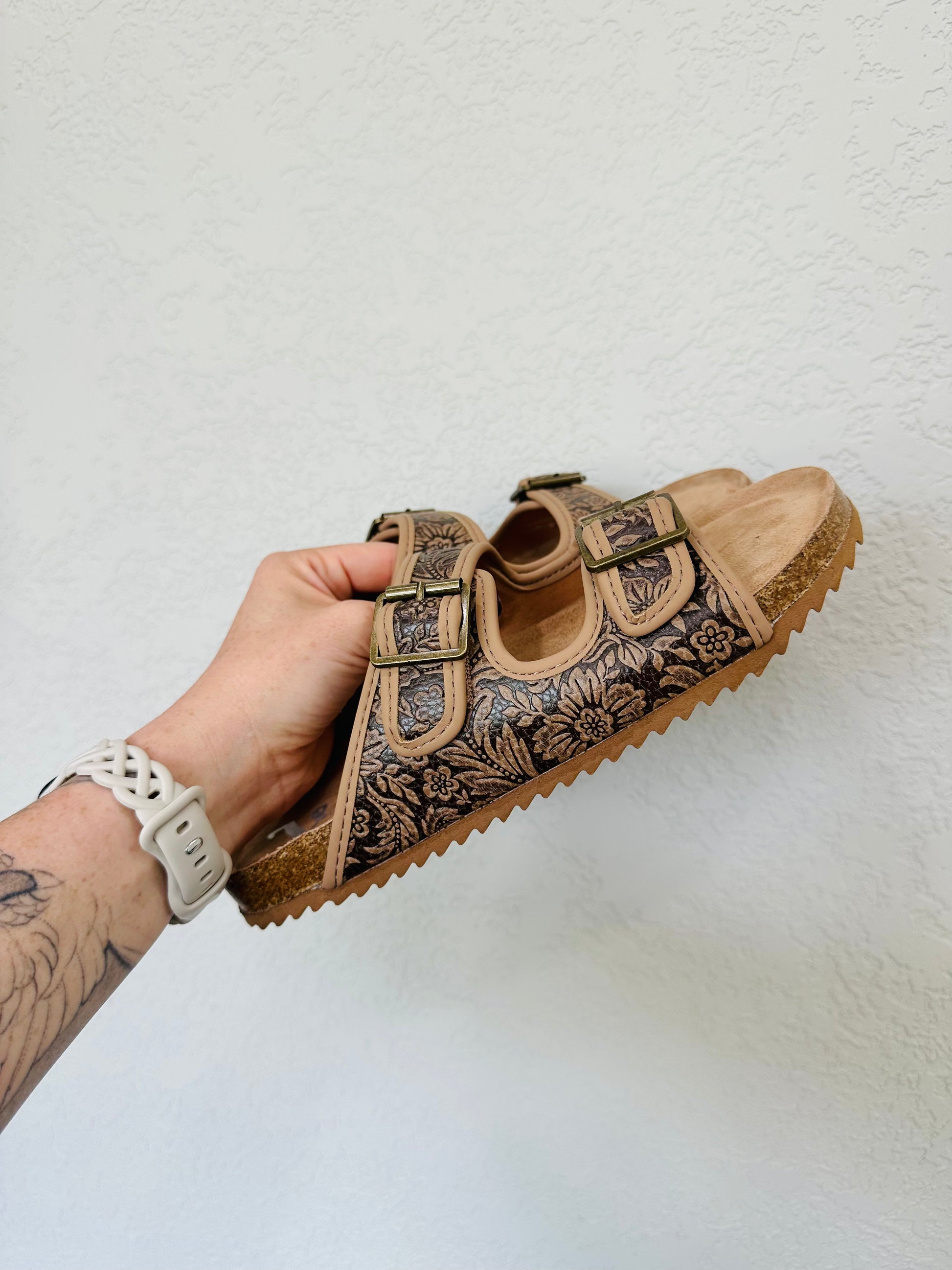 Viral Tambra Tooled Leather Double Buckle Slides - RTS