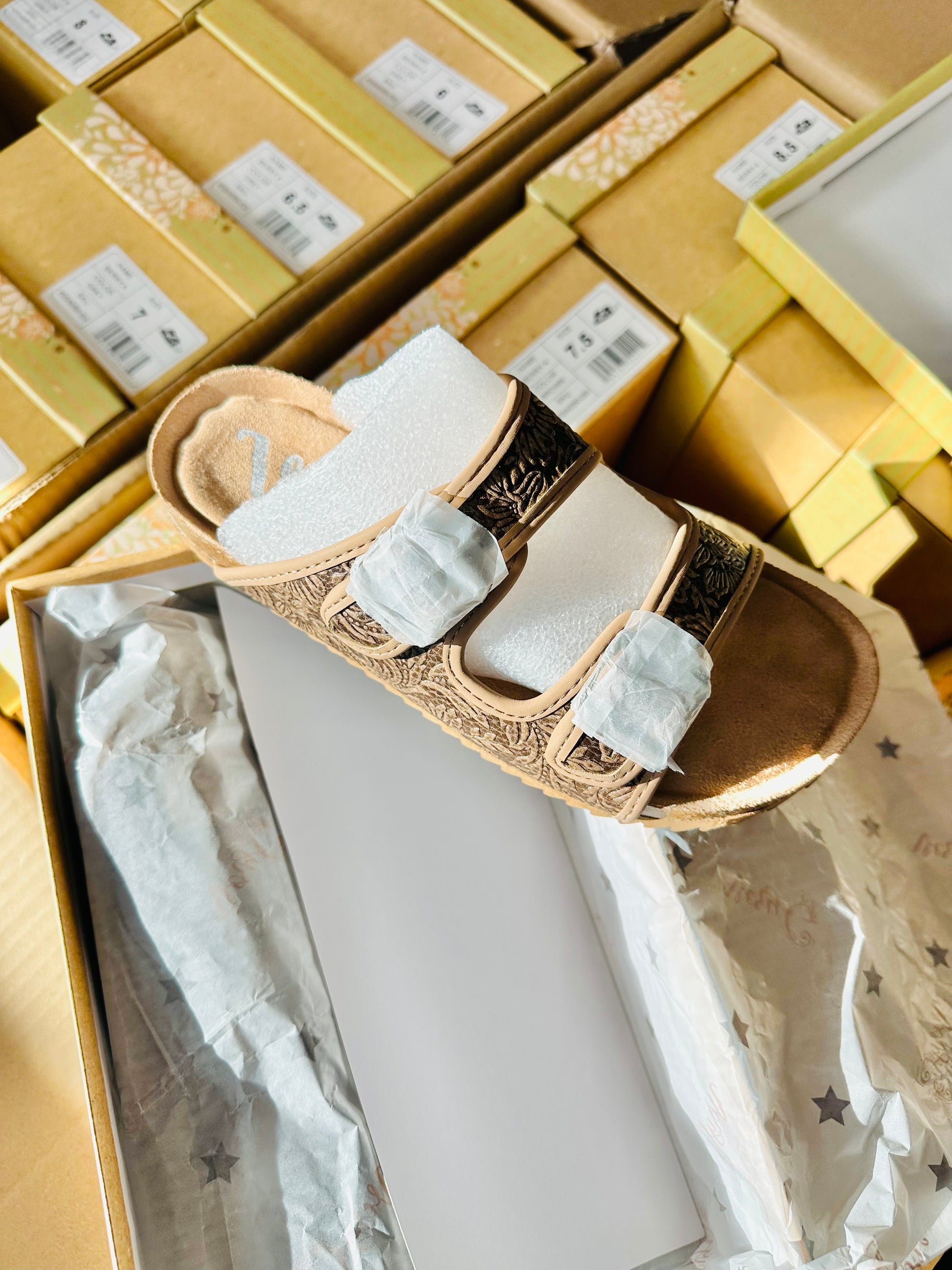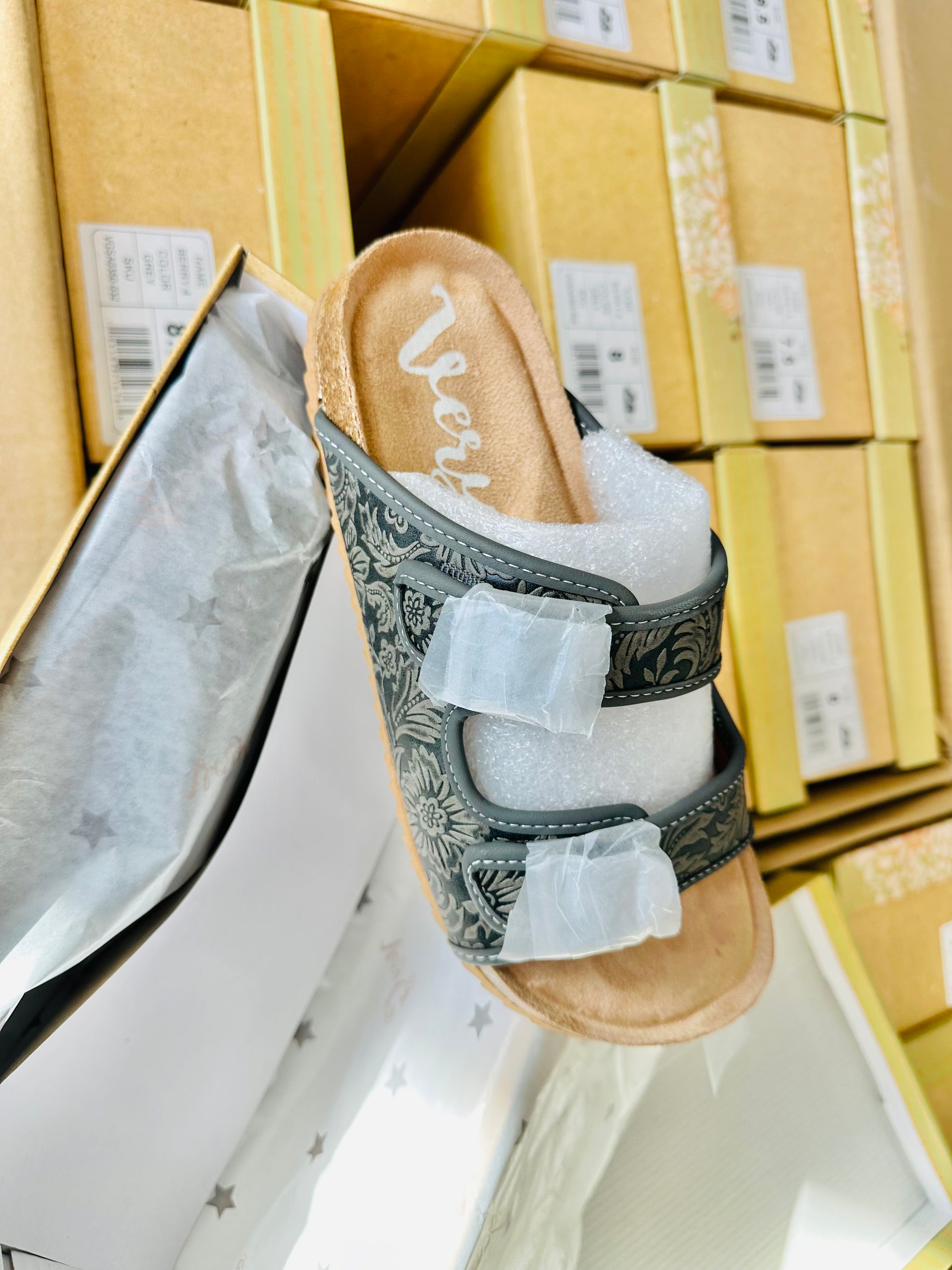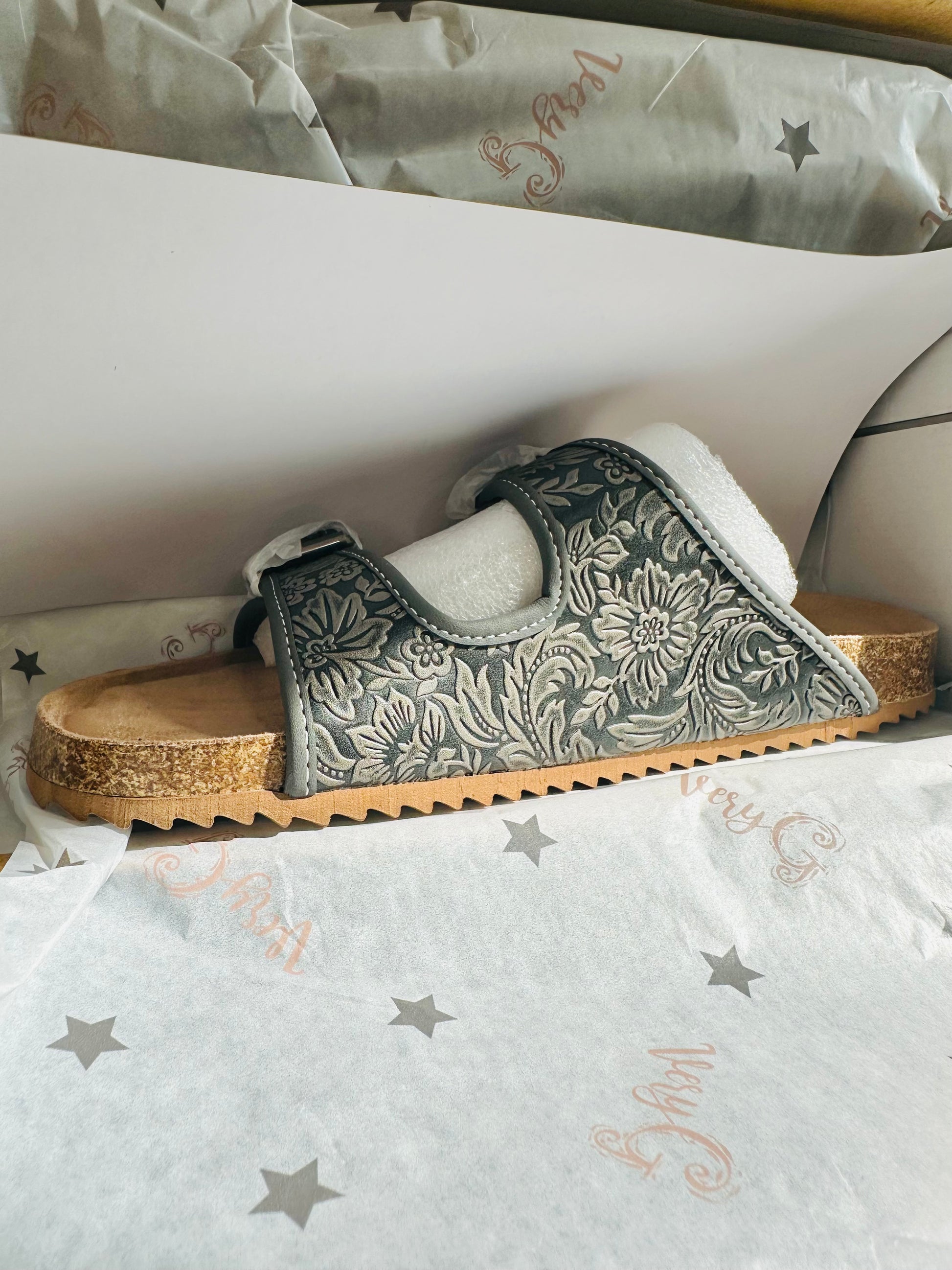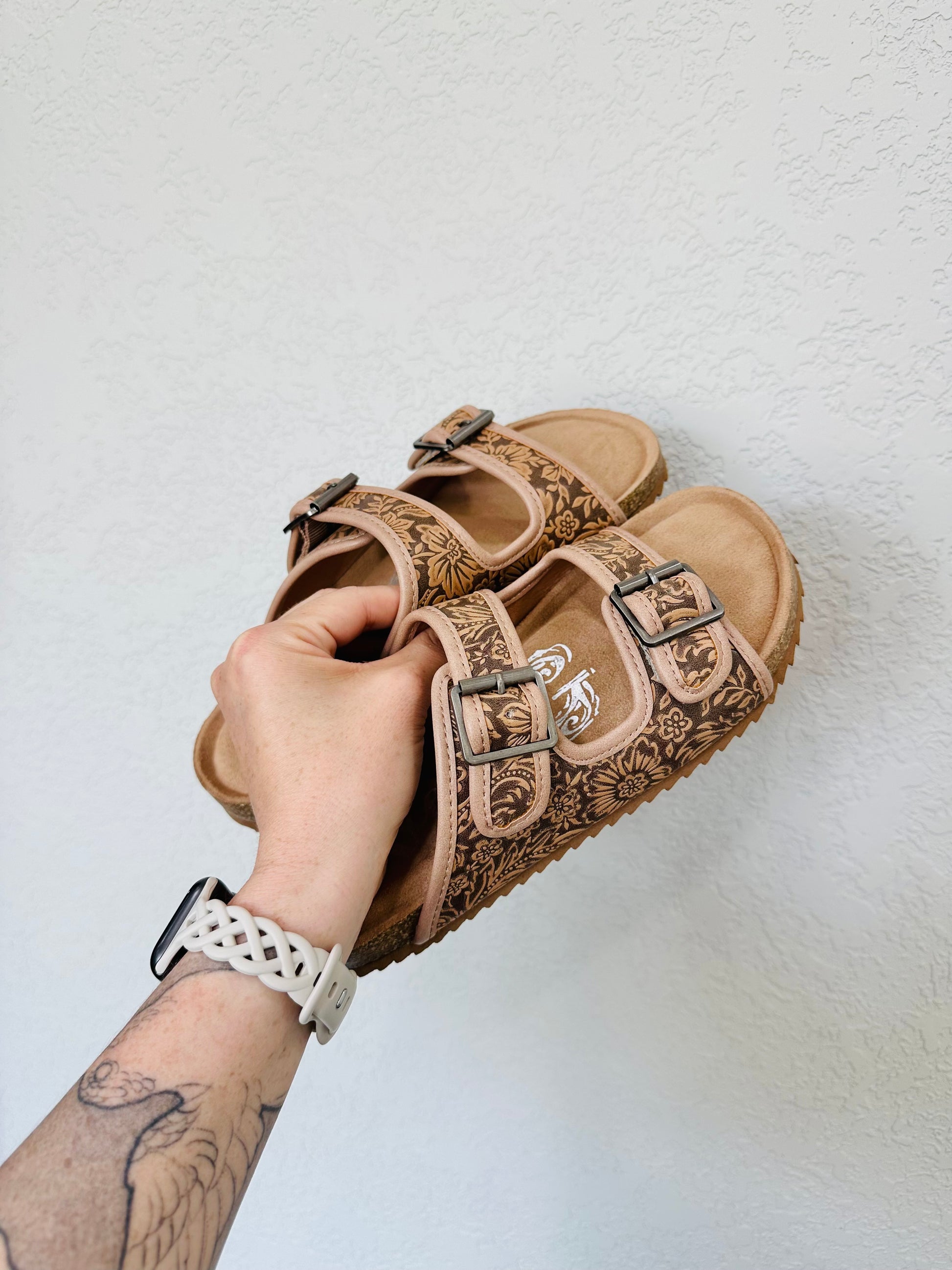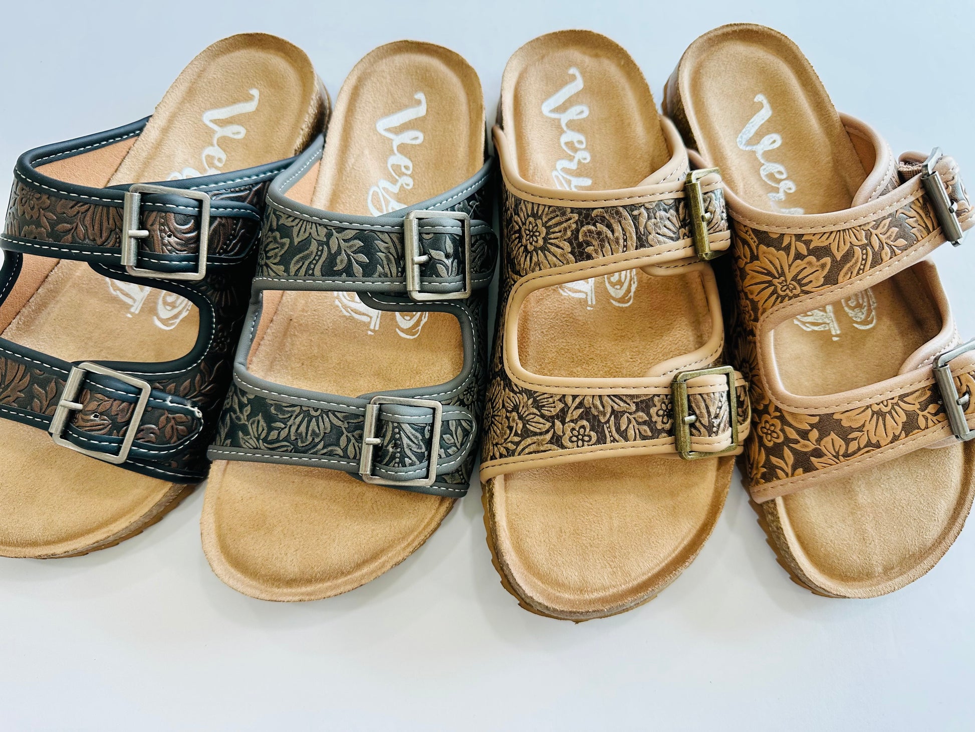 Viral Tambra Tooled Leather Double Buckle Slides - RTS