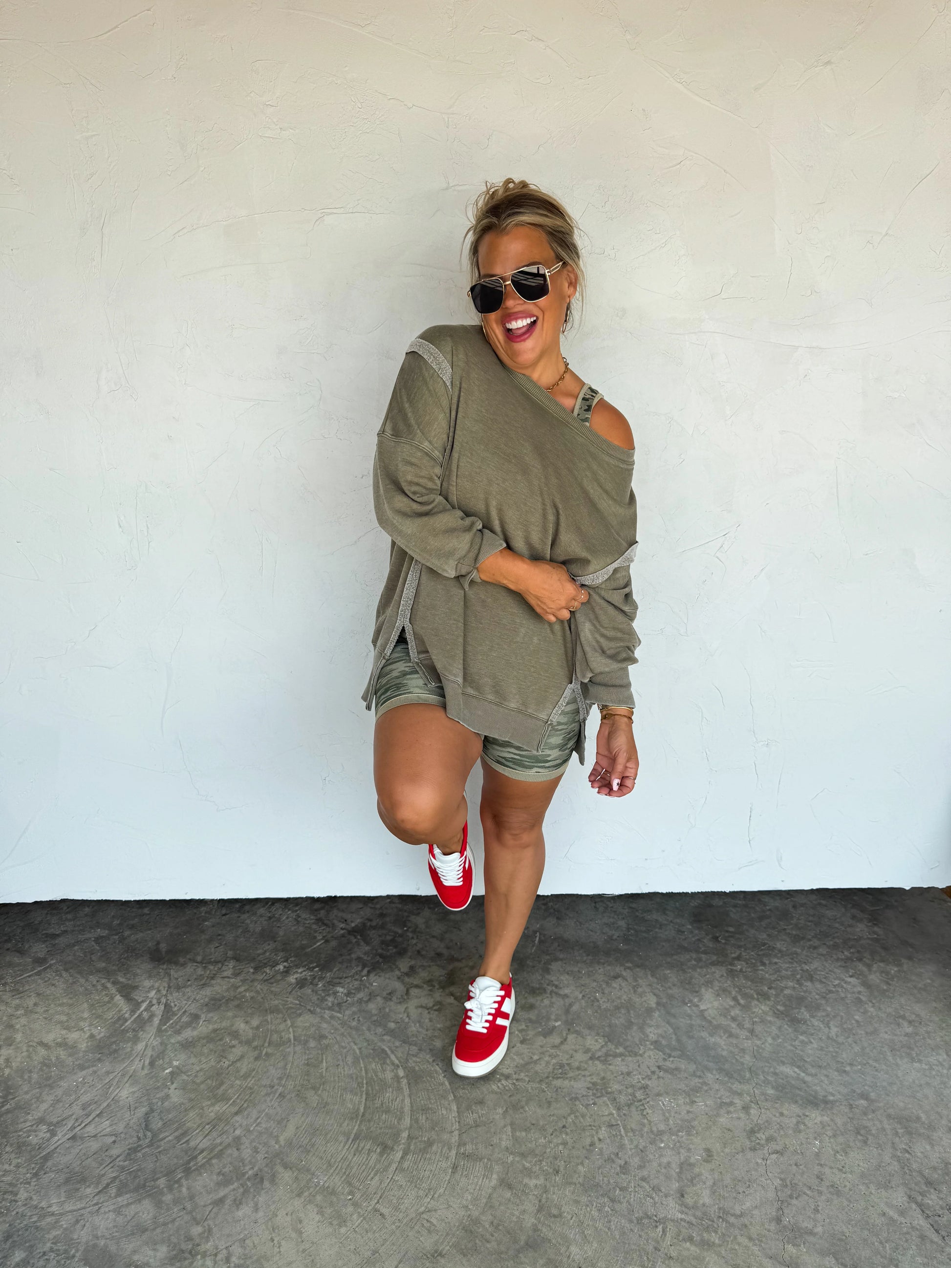 The perfect washed cotton flattering sweatshirt that everyone needs! Faded “vintage” colors. Features flattering rounded front and back hem with side slits!